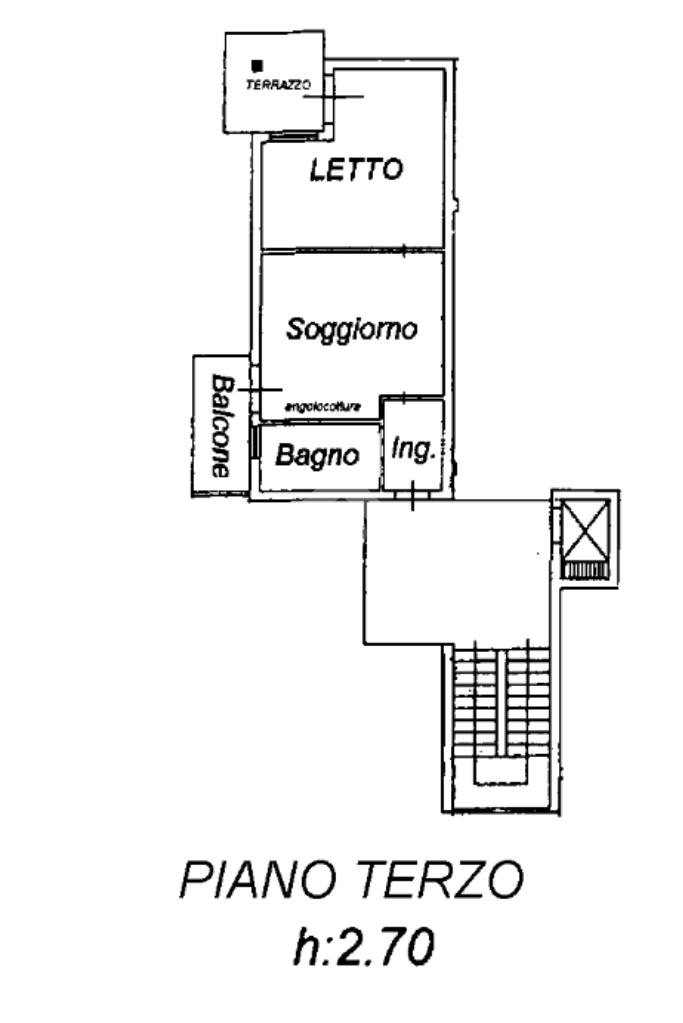 La soluzione si trova al terzo piano con ascensore, composta da: ingresso, disimpegno, un bagno finestrato con box doccia, un ampio soggiorno con angolo cottura ed accesso al balcone, poi abbiamo una camera matrimoniale con un angolo di nicchia per la cabina d'armadio ed un atro balcone che si accede direttamente dalla stanza.